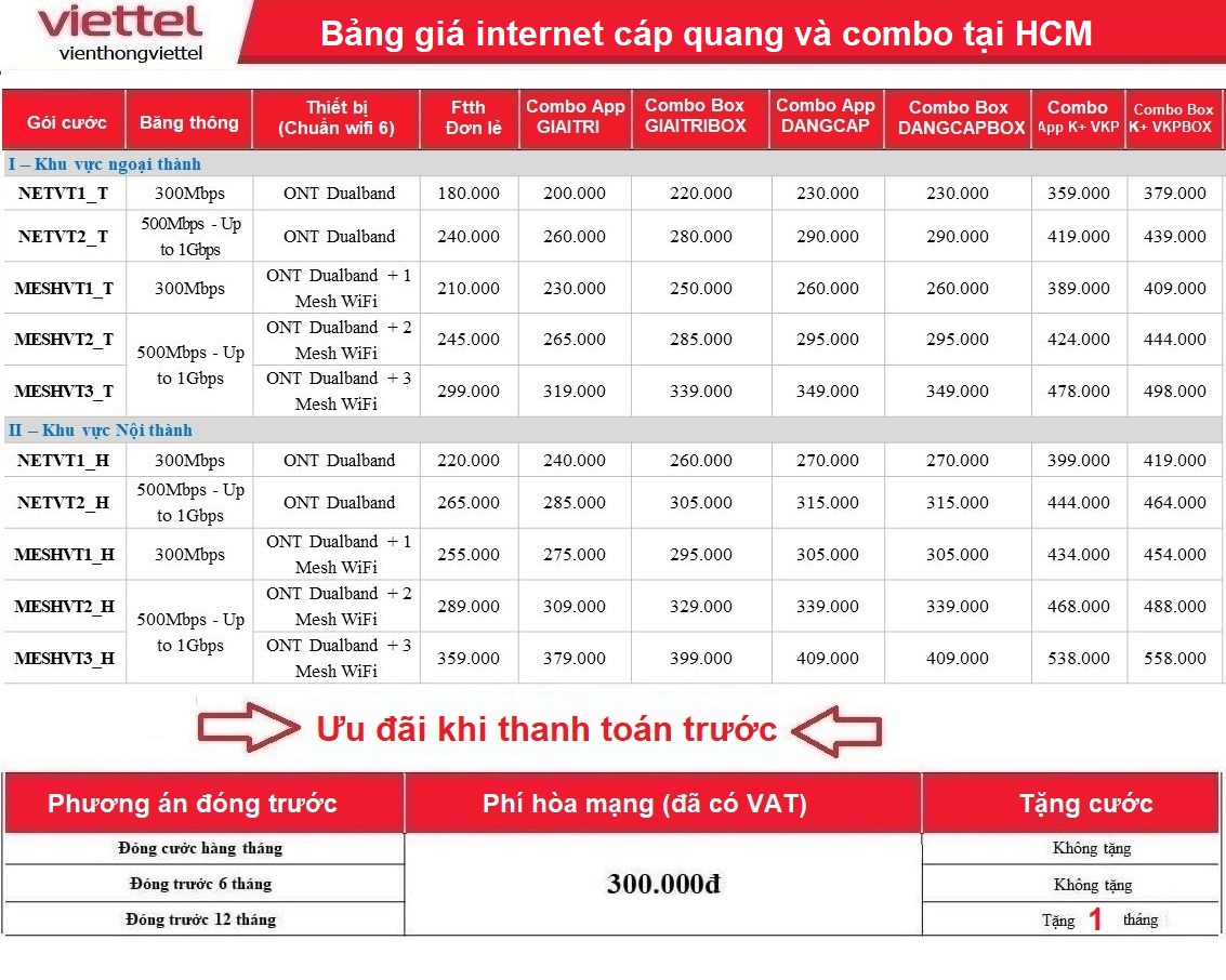 ♦ Giá trên đã bao gồm 10% VAT. + đóng trước 6 tháng tặng 1 tháng cước sử dụng. + đóng trước 12 tháng tặng 3 tháng cước sử dụng.